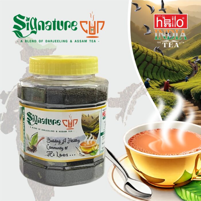 HELLO INDIA TEA SIGNATURE CUP is a product by HELLO INDIA TEA. It’s a blend of Darjeeling and Assam tea, capturing the essence of Indian tea gardens. The brand emphasizes an “Emotion In Every Steaming Cup,” suggesting a focus on the experience of drinking their tea. The Signature Cup blend likely aims to deliver a unique taste profile combining the distinct characteristics of Darjeeling and Assam teas.